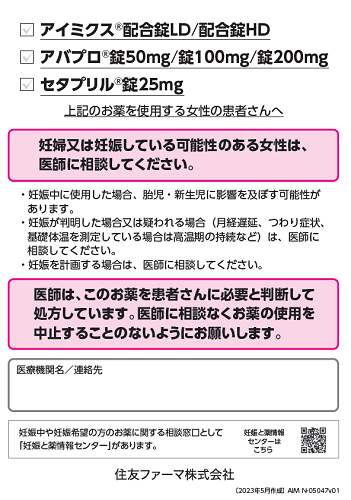 アイミクス、アバプロ、セタプリルを使用する女性の患者さんへ- 20枚綴り